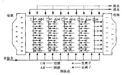 當(dāng)向隔室通入鹽水后,在直流電場(chǎng)作用下,陽(yáng)離子向負(fù)極遷移,通過(guò)陽(yáng)離子交換膜而被阻擋在下一陰離子交換膜;陰離子向正極移動(dòng),通過(guò)陰離子交換膜而被阻擋在下一陽(yáng)離子交換膜,從而使淡室中的鹽水被淡化,濃室(淡室相鄰的一對(duì)陰陽(yáng)膜之間的空間)中的鹽水被濃縮。
